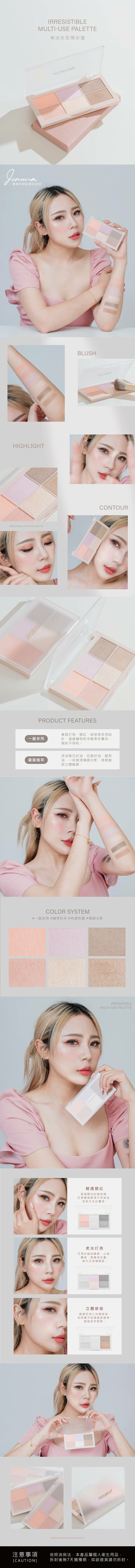 一盤兼具打亮、腮紅、修容等多用設計,富含葵花籽油、亞麻籽油、酪梨油等萃取,細緻礦物粉末輕柔好暈染、服貼不飛粉,一抹融入肌膚展現精緻光影,修飾臉部立體輪廓。